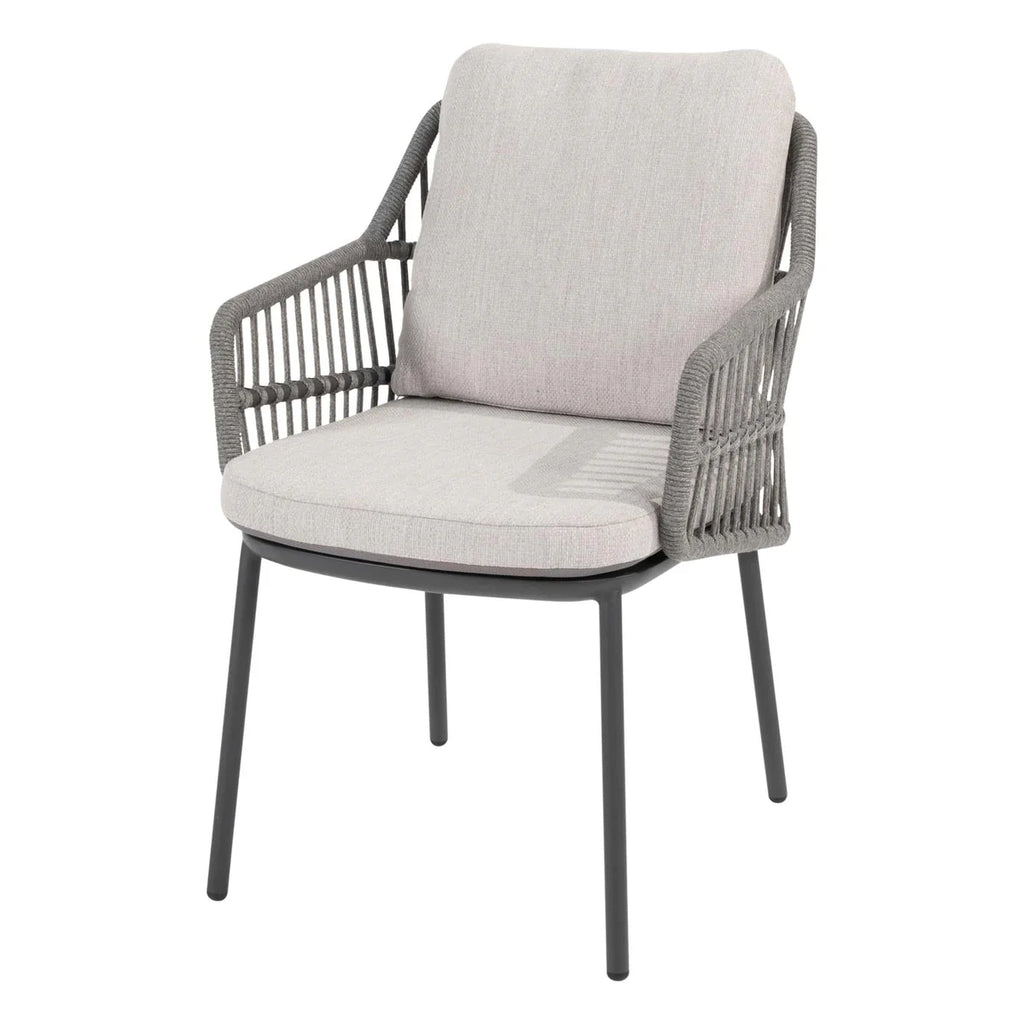 Taste 4SO Alicante antraciet - Manolo is een moderne diningset voor op uw terras. Deze diningset bestaat uit aluminium diningstoel alicante met een prachtige afwerking van rope. De tuintafel manolo heeft een aluminium onderstel en het tafelblad is gemaakt van glas met een keramiek print voor een warme uitstraling.